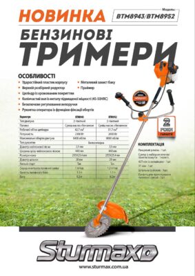 Sturmax BTM8943 – універсальна, продуктивна бензинова коса – призначена для ефективного скошування трави та рослинності на ділянках середньої площі: на присадибній і садовій території, у паркових зонах, скверах, на спортивних майданчиках і. т. п. Інструмент оснащений двотактним, бензиновим двигуном робочим об’ємом 42.7 см3,  штангою з високоміцним сталевим валом усередині і надійним, стійким до навантажень, редуктором – це дозволяє впевнено використовувати бензокосу з різними видами оснащення, включаючи трилопатеві, металеві ножі та багатозубі фрези . Для зниження дії вібрації, що передається від двигуна на руки оператора, на моделі встановлено зчеплення з антивібраційною системою. Швидкому та впевненому пуску інструменту сприяє наявність насоса підкачування палива (праймера), а також системи «EasyStart», що значно знижує тягове зусилля на шнурі стартера під час запуску. Завдяки можливості безключового регулювання рукояті, користувач може налаштувати оптимальне положення без необхідності застосування додаткового інструменту. Модель Sturmax BTM8943 має розширену базову комплектацію, куди входять ранцевий ремінь із захисним набедренником, котушка з ліскою, трилопатевий ніж, багатозуба фреза, а також набір аксесуарів для збирання.