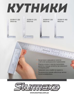 Sturmax 2020M-01-250 – кутник вимірювальний. Довжина 250 мм. Широко використовується в будівництві, деревообробці, металообробці та інших галузях виробництва, та обслуговування, де важливі точні вимірювання. Інструмент виготовлений із міцної та довговічної сталі. Оцинковане покриття захищає кутник від корозії та забезпечує довгий термін його служби. Двостороння шкала сприяє зручності нанесення на поверхню розмітки, а наявність спеціального упора дає змогу зафіксувати інструмент відносно заготовки, забезпечуючи його стабільне положення під час вимірювань і перешкоджаючи його зміщенню.