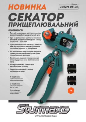 Sturmax 3012M-05-01 – садовий прищепний секатор. Призначений для виконання щеплень на деревах та чагарниках, забезпечуючи точне та чисте з’єднання щепи (частина рослини, зазвичай пагін або гілка, що прищеплюється до іншої рослини) з підщепою (рослина або її частина, на яку прищеплюється щепа). Інструмент значно спрощує процес щеплення, підвищуючи шанси на успішне зрощення завдяки точним та однаковим розрізам. Оснащений унікальними лезами, які дають змогу здійснювати розрізи різної форми, сприяючи максимально щільному та надійному з’єднанню. Виготовлені з високовуглецевої сталі (HCS) леза вирізняються чудовою ріжучою здатністю, що критично важливо для чистоти зрізів та швидкого загоєння, та характеризуються тривалим терміном служби. Модель має невелику вагу та компактні габарити, що сприяють зручності використання. Безпеку інструмента гарантує надійний механізм блокування.