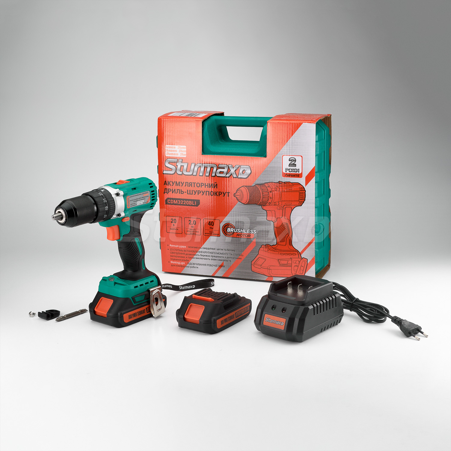 Sturmax CDM3220BLI Brushless — акумуляторний, ударний 20В двошвидкісний шурупокрут нового покоління. Одна з найважливіших особливостей моделі — безщітковий електромотор — завдяки йому збільшується стійкість до перевантажень і забезпечується найкраща продуктивність роботи на одному заряді АКБ. Крім того, такий мотор не схильний до перегрівання і дає змогу довше працювати без перерви. Шурупокрут демонструє високі показники за крутним моментом (макс. крутний момент — 40 Нм) — це дає можливість використовувати інструмент для робіт із кріпленням великої довжини. Інструмент має відмінне оснащення: надійний металевий 13 мм патрон, функція блокування вала шпинделя, електронне гальмо вибігу двигуна, LED підсвічування з нижнім розміщенням, ударний механізм, для ефективного свердління цегли, та легкого бетону. Комфорт користування гарантують продумана ергономіка та вивірені масогабаритні показники. Для зручності зберігання і транспортування шуруповерт комплектується міцним пластмасовим кейсом.