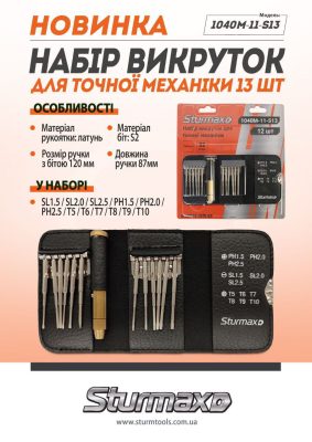 Sturmax 1040M-11-S13 – набір викруток для точної механіки. Включає 13 змінних біт із міцної інструментальної сталі S2. Рукоятка виконана з латуні, що забезпечує надійний хват і довговічність інструменту. До комплекту входять біти SL (1.5, 2.0, 2.5), PH (1.5, 2.0, 2.5) і Torx (T5, T6, T7, T8, T9, T10), що дають змогу виконувати широкий спектр точних робіт, наприклад, ремонт електроніки, годинників, окулярів та інших дрібних механізмів і предметів. Комплект поставляється в компактному чохлі для зручного зберігання і транспортування.