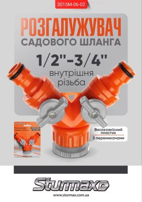 ГоловнаКаталогАксесуари для системи поливуSturmax 3015M-06-02 Розгалужувач садового шланга, вн. різьба. Y тип