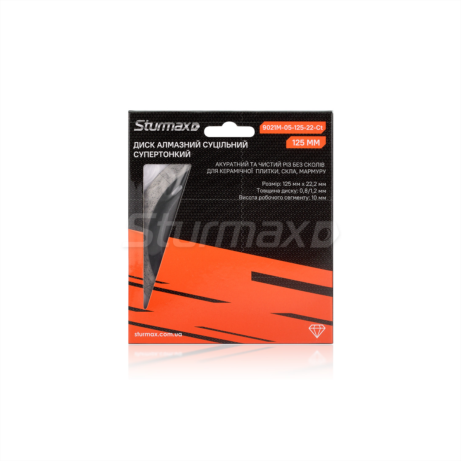 Sturmax 9021M-05-125-22-Ct – диск алмазний суцільний супертонкий. Зовнішній діаметр – 125 мм. Внутрішній (посадковий) діаметр – 22.2 мм. Призначений для високоточного різання керамічної плитки, кахлю, мармуру, скла. Суцільна ріжуча кромка з рівномірним алмазним шаром забезпечує чистий та рівний різ, без відколів, що особливо важливо під час роботи з крихкими та декоративними матеріалами. Товщина алмазного шару в 10 мм сприяє тривалому терміну служби диска навіть при інтенсивній експлуатації.