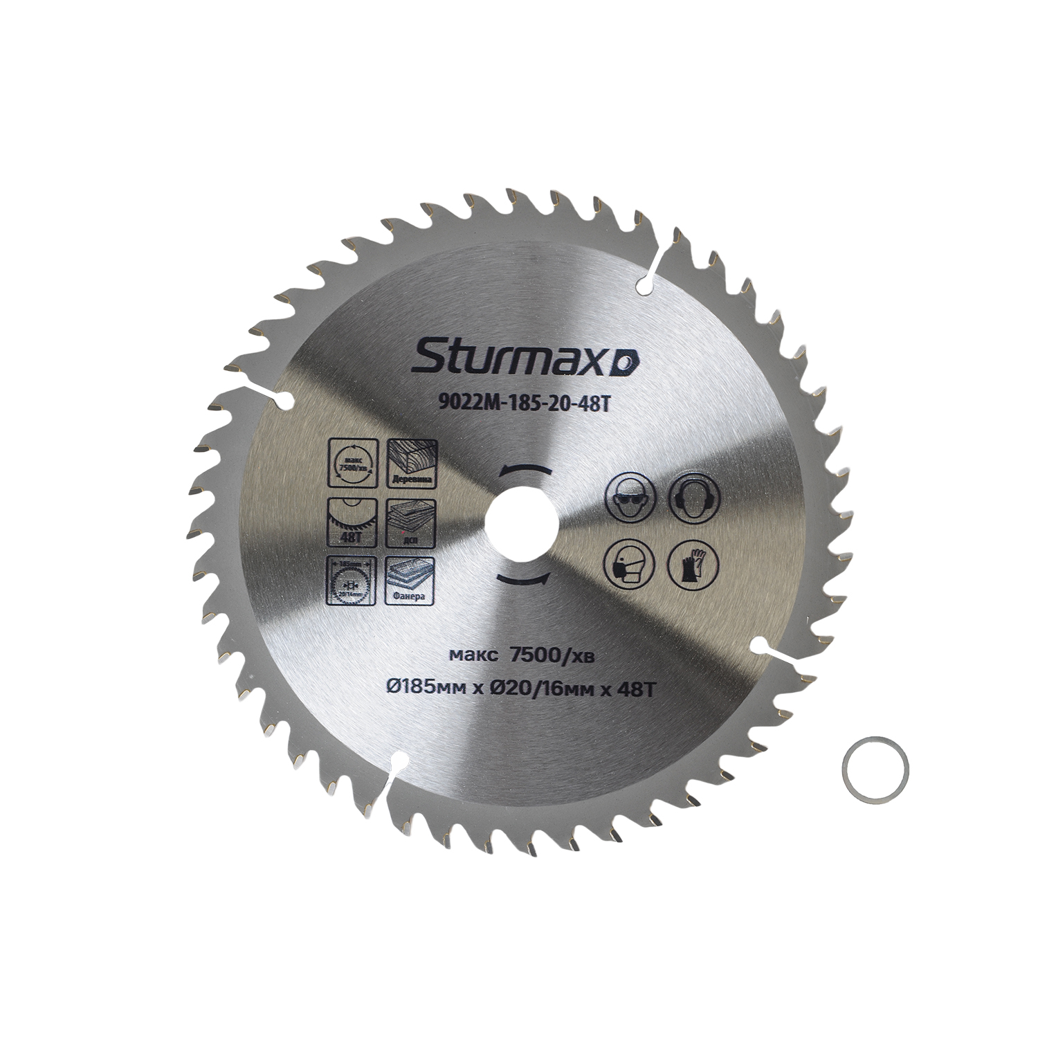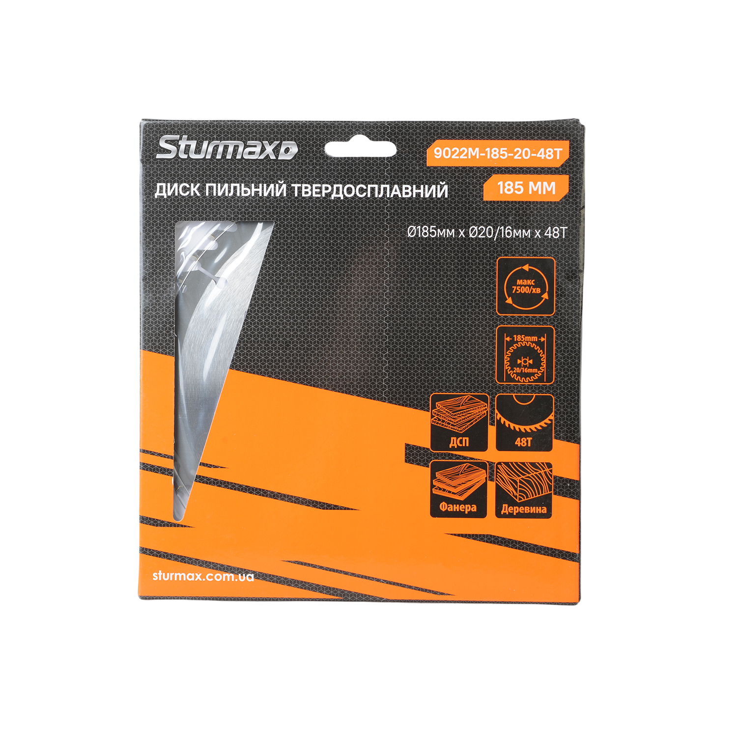 Sturmax 9022M-185-20-48T – пиляльний диск для робіт із м’якими та твердими породами деревини, фанерою. Зовнішній діаметр – 185 мм, внутрішній посадковий діаметр – 20 / 16 мм. Кількість зубів – 48. Завдяки зворотному куту нахилу зуба має високу якість різу і максимально ефективний при виконанні чистих поперечних розпилів. Тіло диска виконано із загартованої вуглецевої сталі. Наявність твердосплавних напайок з карбіду вольфраму ВК8, забезпечує значно кращу зносостійкість, у порівнянні з суцільносталевими аналогами. Щоб диск не перегрівався і не відхилявся від прямолінійної траєкторії в процесі роботи, конструкцією передбачено температурні компенсатори – радіально розташовані спеціальні прорізи, що сприяють рівномірному розподілу температури по всьому тілу диска, унеможливлюючи припікання.
