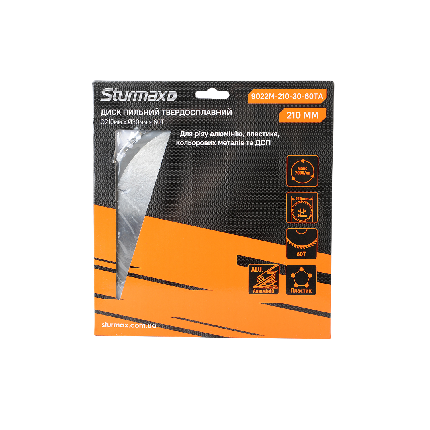 Sturmax 9022M-210-30-60TA – пиляльний диск для робіт із ламінатом, алюмінієм, кольоровими металами, ДСП і пластиком. Зовнішній діаметр – 210 мм, внутрішній посадковий діаметр – 30 мм. Кількість зубів – 60. Завдяки зворотному куту нахилу зуба має високу якість різу і максимально ефективний при виконанні чистих поперечних і поздовжніх розпилів. Тіло диска виконано із загартованої вуглецевої сталі. Наявність твердосплавних напайок з карбіду вольфраму ВК8 забезпечує значно кращу зносостійкість, порівняно з суцільносталевими аналогами. Щоб диск не перегрівався і не відхилявся від прямолінійної траєкторії в процесі роботи, конструкцією передбачені температурні компенсатори – радіально розташовані спеціальні прорізи, які сприяють рівномірному розподілу температури по всьому тілу диска, унеможливлюючи можливість припікання.