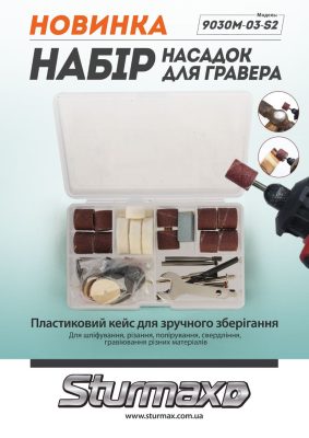 Sturmax 9030M-03-S2 – набір насадок для гравера. Використовується під час проведення слюсарних та столярних робіт, є незамінним помічником при будівництві або ремонті. Насадки відмінно підійдуть для операцій зі шліфування, різання, полірування, свердління різних матеріалів. Виготовлені з високоякісних матеріалів та мають тривалий термін служби. Кількість елементів у комплекті – 65.