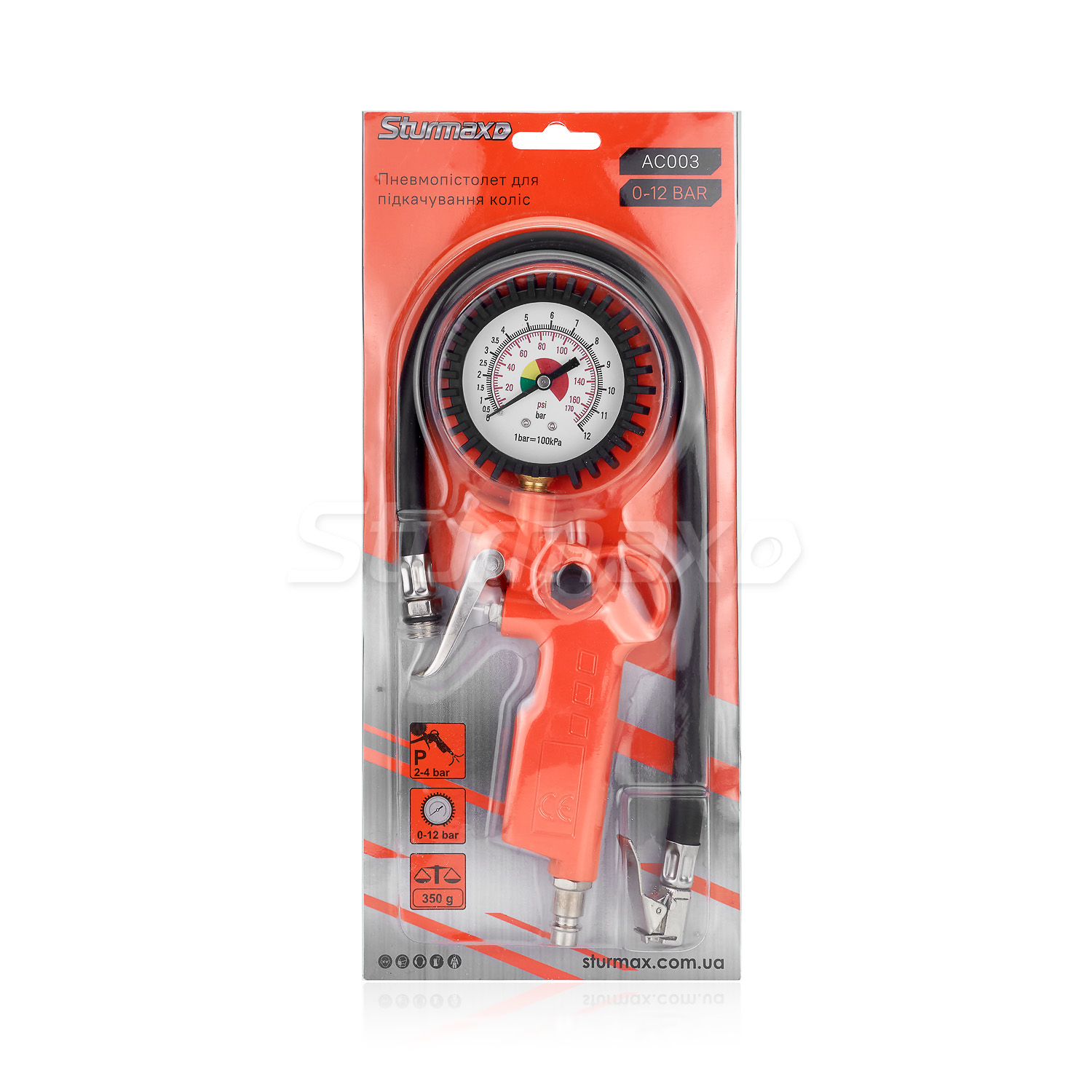 Sturmax AC003 – пневмопістолет для підкачування шин з манометром. Призначений для підтримки оптимального тиску в шинах різних транспортних засобів. Для зручності користувача оснащений вбудованим манометром, який дає змогу точно контролювати тиск у процесі використання.