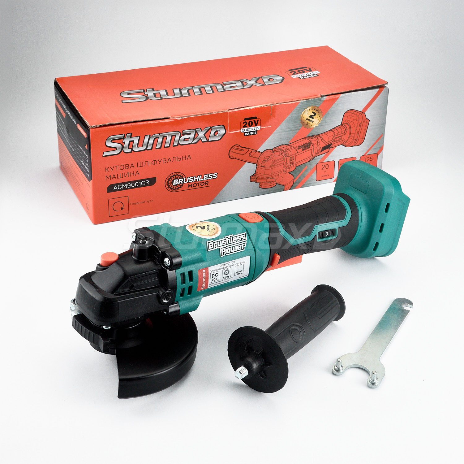 Sturmax AGM9001CR – компактна акумуляторна 20В болгарка (КШМ) лінійки інструменту Sturmax Cordless Range під єдину акумуляторну платформу. Завдяки оптимальному компонуванню модель відмінно лежить у руках, вивірені масогабаритні показники сприяють кращому контролю інструменту навіть під час роботи в умовах з важким доступом, а відсутність прив’язки до електромережі значно підвищує маневреність. Інструмент має ретельно опрацьовану ергономіку: на відміну від більшості компактних болгарок під робочий діаметр диска 125 мм, оснащений поворотною основною рукояткою, а також має три гнізда кріплення для додаткової рукояті, що забезпечує додатковий комфорт під час зачисних операцій. Важлива особливість Sturmax AGM9001CR – наявність потужного безщіткового електромотора – завдяки йому збільшується стійкість до перевантажень та забезпечується краща продуктивність роботи на одному заряді АКБ. Крім того, такий мотор не схильний до перегрівання та дає змогу довше працювати без перерви. Для унеможливлення пошкоджень інструменту під час роботи в режимі підвищених навантажень передбачений спеціальний захист – електроніка вимкне живлення в разі надмірного навантаження на електромотор. До переваг моделі варто віднести систему плавного пуску, що запобігає стартовому ривку інструменту в момент увімкнення та регулювання кількості обертів у широкому діапазоні від 4000 до 10000 об/хв. За безпеку використання відповідає функція блокування від ненавмисного запуску. Для більшої зручності та зниження витрат часу на підготовчі дії болгарка комплектується захисним кожухом зі швидкозатискним кріпленням.
