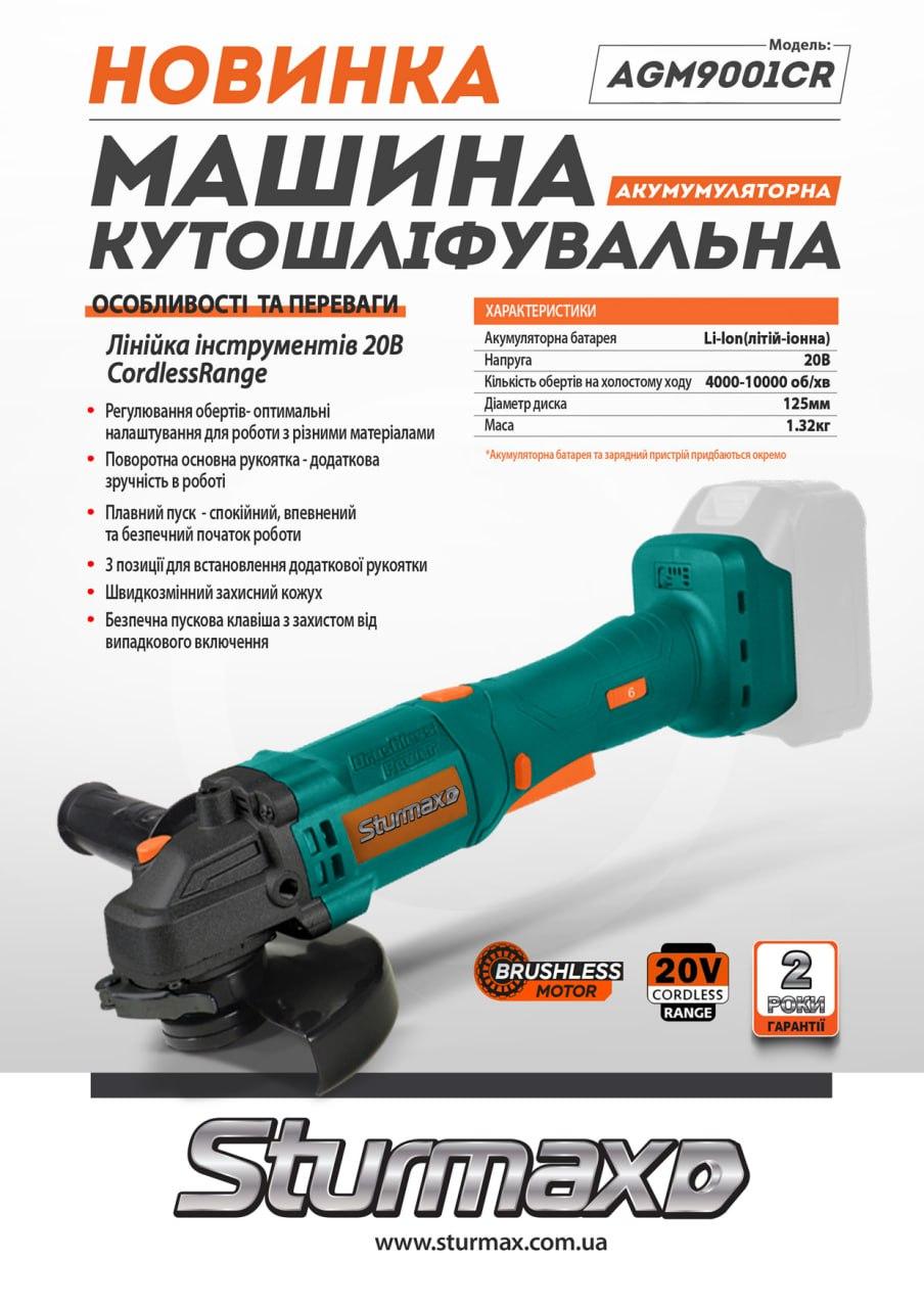 Sturmax AGM9001CR Акумуляторна болгарка (КШМ) 20В