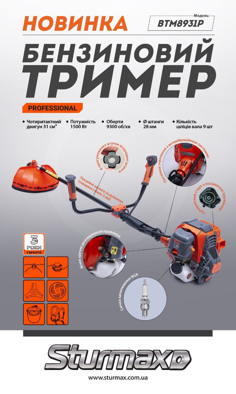 Sturmax BTM8931P Бензинова мотокоса 4Т двигун 1500 Вт – Sturmax