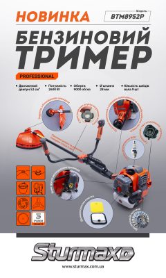 Sturmax BTM8952P – універсальна, продуктивна бензинова коса професійної лінійки інструменту Sturmax Professional. Призначена для ефективного скошування трави та рослинності на ділянках середньої та великої площі: на присадибній і садовій території, у паркових зонах, скверах, на спортивних майданчиках тощо. Інструмент оснащений двотактним бензиновим двигуном робочим об’ємом 52 см³ з посиленою циліндро-поршневою групою та зчепленням, а також штангою з високоміцним сталевим валом усередині та надійним, стійким до навантажень, редуктором – це дозволяє впевнено використовувати бензокосу з різними видами оснастки, включаючи трилопатеві металеві ножі, багатозубі фрези, культиваторні та висоторізні насадки. Швидкому та впевненому запуску інструменту за різних температурних умов сприяють насос підкачки пального (праймер), високоякісна свічка запалювання NGK, а також система «EasyStart», що значно знижує тягове зусилля на шнурі стартера при запуску. Ефективний захист двигуна від пилу та абразивних частинок забезпечує спеціальний двокомпонентний фільтр. Модель Sturmax BTM8952P має розширену базову комплектацію, до якої входять ранцевий наплічний ремінь, пластикова шпулька з лiскою, алюмінієва шпулька з лiскою, трилопатевий ніж, 24Т ніж, 40Т ніж, захисна маска, а також набір аксесуарів для збирання.
