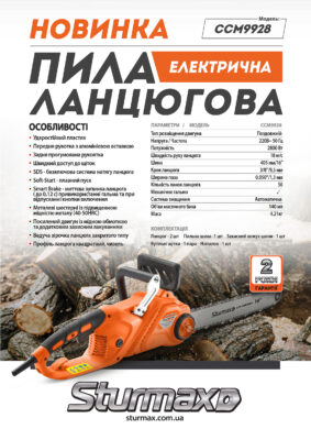 Sturmax CCM9928 – сучасна універсальна ланцюгова електропила. Модель виконана за схемою з поздовжнім розташуванням двигуна. Порівняно з поперечномоторним компонуванням, де двигун встановлений збоку, це сприяє меншим габаритним розмірам інструменту, внаслідок чого досягається максимальна зручність під час робіт в умовах обмеженого простору, а також оптимальне центрування, яке гарантує кращий контроль пили користувачем. Надійність хвата забезпечують задня прогумована рукоять та передня D-подібна рукоять із міцною алюмінієвою вставкою. Корпус, виконаний з високоякісного ударостійкого пластику, надійно захищає інструмент від механічних пошкоджень під час експлуатації. Завдяки продуктивному (2800 Вт) електродвигуну та потужному редуктору, пила розвиває високу швидкість обертання ланцюга в 1080 м/хв, що сприятливо впливає як на швидкість одиничного пропилу, так і на продуктивність загалом. Наявність системи плавного пуску Soft Start дає змогу виключити стартовий ривок під час запуску інструмента. Для швидкого та легкого налаштування оптимального натягу ланцюга передбачена безключова SDS-система натягу. Важливою особливістю моделі є система активного гальма ланцюга Smart Brake – вона гарантує безпеку використання інструменту, забезпечуючи миттєву зупинку ланцюга (час спрацьовування до 0.12 с) під час натискання на гальмівний щиток, або під час відпускання кнопки ввімкнення. Також для безпеки користувача передбачено захист від ненавмисного пуску та можливість фіксації мережевого подовжувача до пилки за допомогою спеціального зачіпного гака. Безвідмовність та довгий термін служби пили забезпечують застосування в конструкції якісних комплектуючих, а також ряд технічних рішень: посилений двигун із мідною обмоткою та додатковим захисним лакуванням, металеві шестерні редуктора зі сталі підвищеної міцності (40-50 HRC), пилозахищені підшипники, приводна зірочка закритого типу. Зручності обслуговування сприяє функція швидкого доступу до щіток, що дає змогу проводити їхню заміну без демонтажу елементів корпусу. У комплектацію моделі Sturmax CCM9928 включено два високоякісні чизельні пильні ланцюги з квадратним профілем зуба.