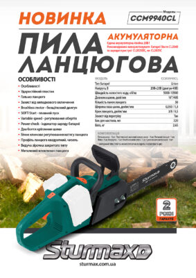 Sturmax CCM9940CL Brushless – сучасна та продуктивна, універсальна 40В акумуляторна ланцюгова пила. Живлення інструменту здійснюється одночасно від двох 20В акумуляторів, які крім цієї моделі можна використовувати для інших інструментів 20В лінійки Sturmax під єдину акумуляторну платформу. Пила має чудову ергономіку, а завдяки компактним габаритам та невеликій масі, маневрена, та легка у використанні, в тому числі, при роботах в умовах обмеженого простору. Корпус виконаний з якісного ударостійкого пластику та надійно захищає інструмент від можливих механічних пошкоджень під час експлуатації. Двошпилечне кріплення шини перешкоджає її перекосу в процесі роботи, а привідна зірочка закритого типу запобігає зісковзуванню ланцюга. Одна з найважливіших конструктивних особливостей Sturmax CCM9940CL – потужний безщітковий електромотор – завдяки йому збільшується стійкість до перевантажень та гарантується краща продуктивність роботи на одному заряді АКБ. Крім того, такий мотор не схильний до перегріву та дає змогу довше працювати без перерви. Передбачено функцію плавного пуску Soft Start, що виключає стартовий ривок, та функцію регулювання обертів Variable Speed, що сприяє налаштуванню оптимальної швидкості ланцюга. Наявність бічного механізму натягу ланцюга забезпечує зручність під час використання, а вбудований індикатор заряду батареї Power Check дає змогу візуально контролювати рівень заряду акумулятора. За безпеку використання відповідають: механічне гальмо ланцюга, захист від випадкового ввімкнення, а також металевий уловлювач ланцюга. Модель комплектується високоякісним чизельним пиляльним ланцюгом із квадратною формою зуба.