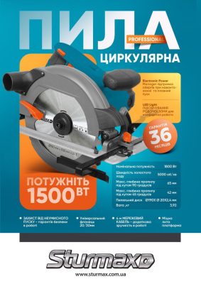Sturmax CSM50190P – універсальна, продуктивна циркулярна пила професійної серії інструменту Sturmax Professional. Діаметр пильного диска – 185 мм. Призначена для виконання поздовжніх і поперечних різів у деревині різної твердості та її похідних. Модель оснащена потужним 1800 Вт електродвигуном і високоміцним редуктором, що дозволяють впевнено здійснювати розпилювання матеріалу на максимальну глибину до 63 мм. Завдяки функції регулювання глибини різу шляхом зміни положення опорної платформи, користувач може налаштувати та зафіксувати бажану глибину занурення диска. Також, передбачена можливість виконання кутових різів. Точне налаштування інструменту перед використанням забезпечує шкала з градусною розміткою. Блокування шпинделя дозволяє максимально швидко та легко замінювати оснастку. Наявність литої опорної платформи гарантує високу точність різу та кращу стійкість інструменту в процесі роботи. Для безпеки користувача модель отримала посилений кожух, а також захист від ненавмисного запуску. У стандартну комплектацію моделі Sturmax CSM50190P входять: пильний диск (встановлений на інструменті), ключ, паралельна направляюча та адаптер для підключення будівельного пилососа.