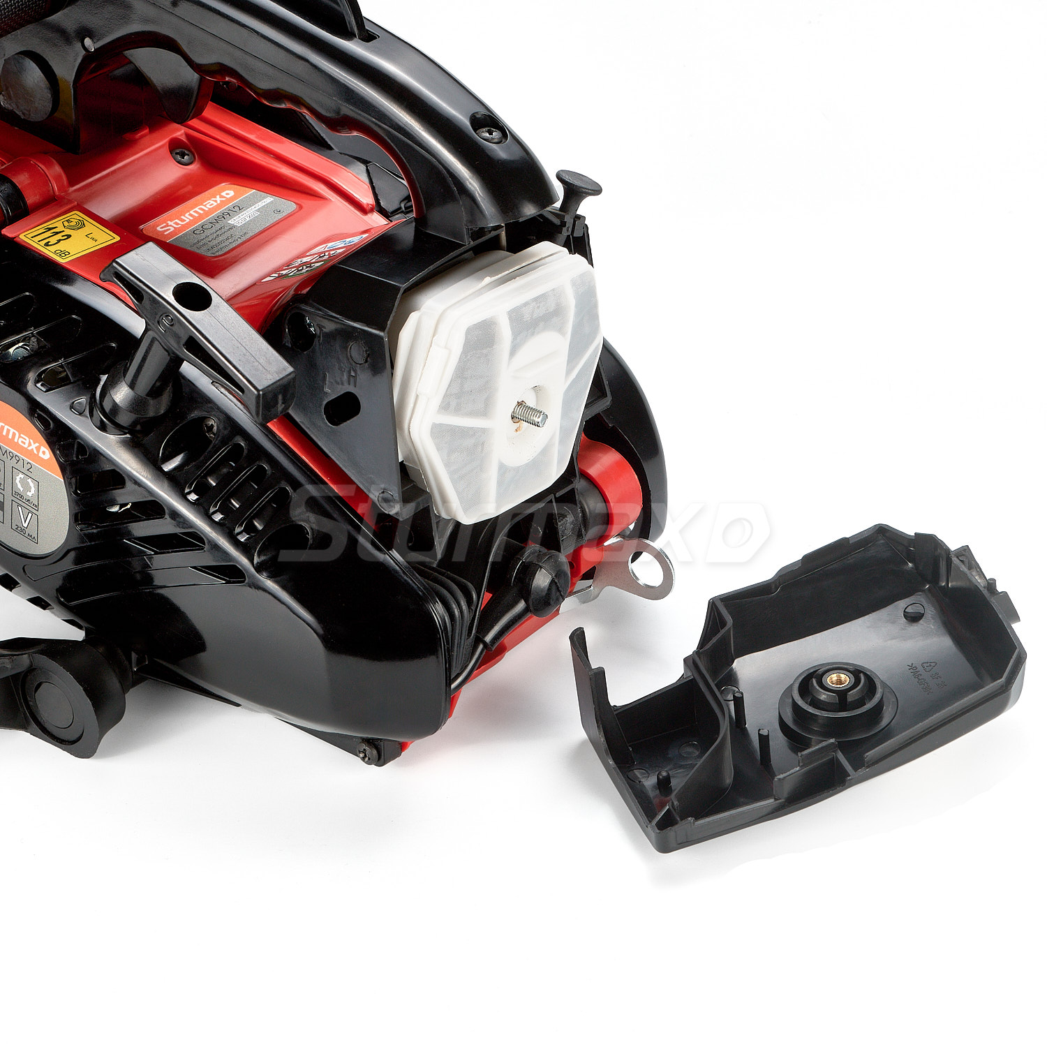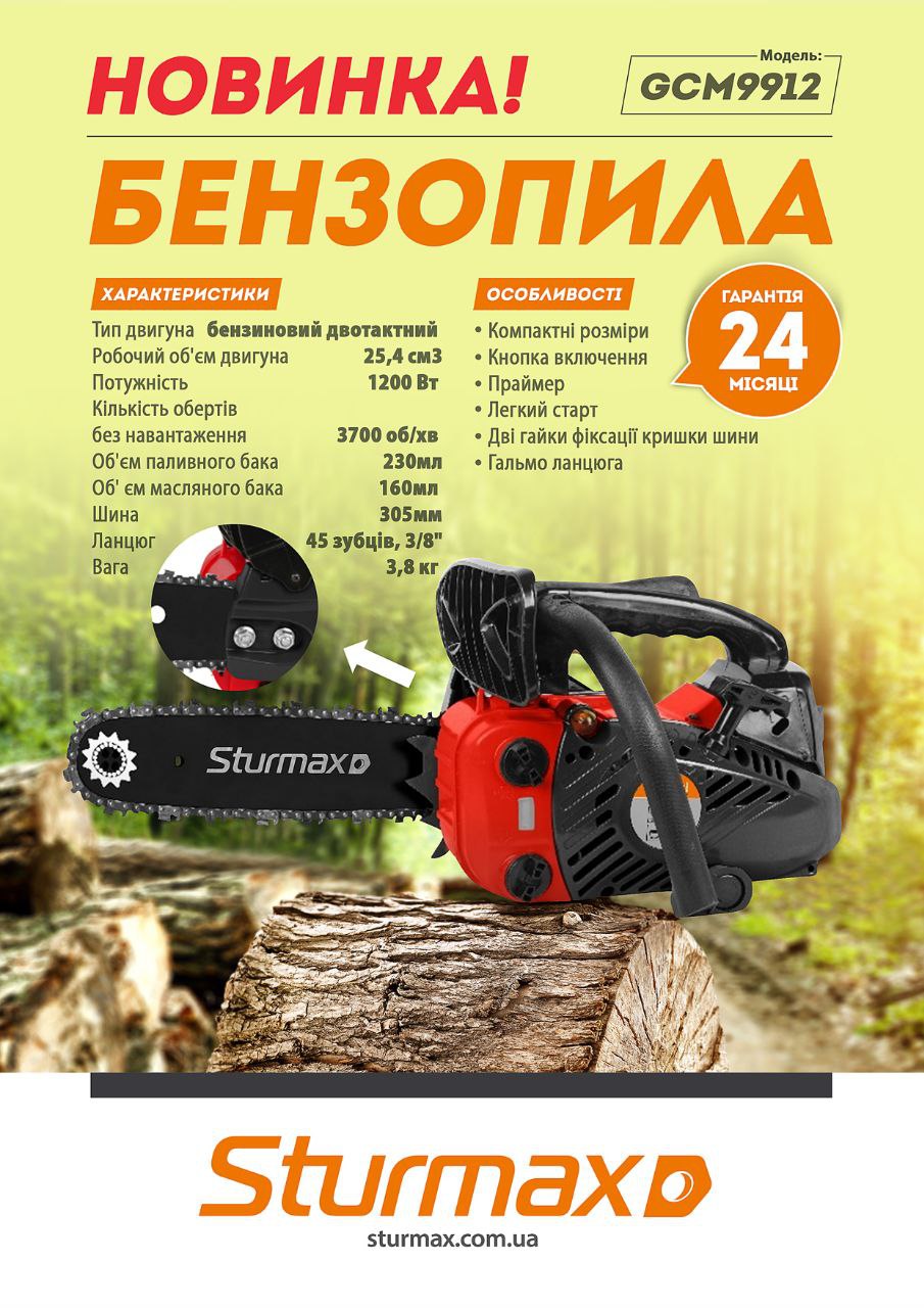 Sturmax GCM9912 – суперкомпактна універсальна бензинова пила для садових і висотних робіт. Модель має незвичайне компонування, що дає змогу домогтися істотної мінімізації габаритів і маси – легкий і дуже маневрений інструмент сприяє ефективності роботи в умовах із важким доступом і дуже зручний у транспортуванні (у повністю зібраному стані довжина пили трохи більша за 50 см). Інструмент оснащено економічним двотактним бензиновим двигуном робочим об’ємом 25,4 куб. см (потужність 1200 Вт) і 305 мм пиляльною шиною. До числа особливостей моделі можна віднести двошпилечне кріплення шини, автоматичний привід повітряної заслінки, бічне розміщення пристрою натягу ланцюга. Простота управління та обслуговування дають змогу впевнено експлуатувати модель навіть користувачам, які не мають досвіду роботи з бензопилами.