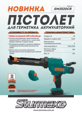 ГоловнаКаталогАкумуляторна 20В лінійка інструменту Сordless Range під єдину АКБSturmax GM2520CR Пістолет для герметика акумуляторний 20В,Cordless Range