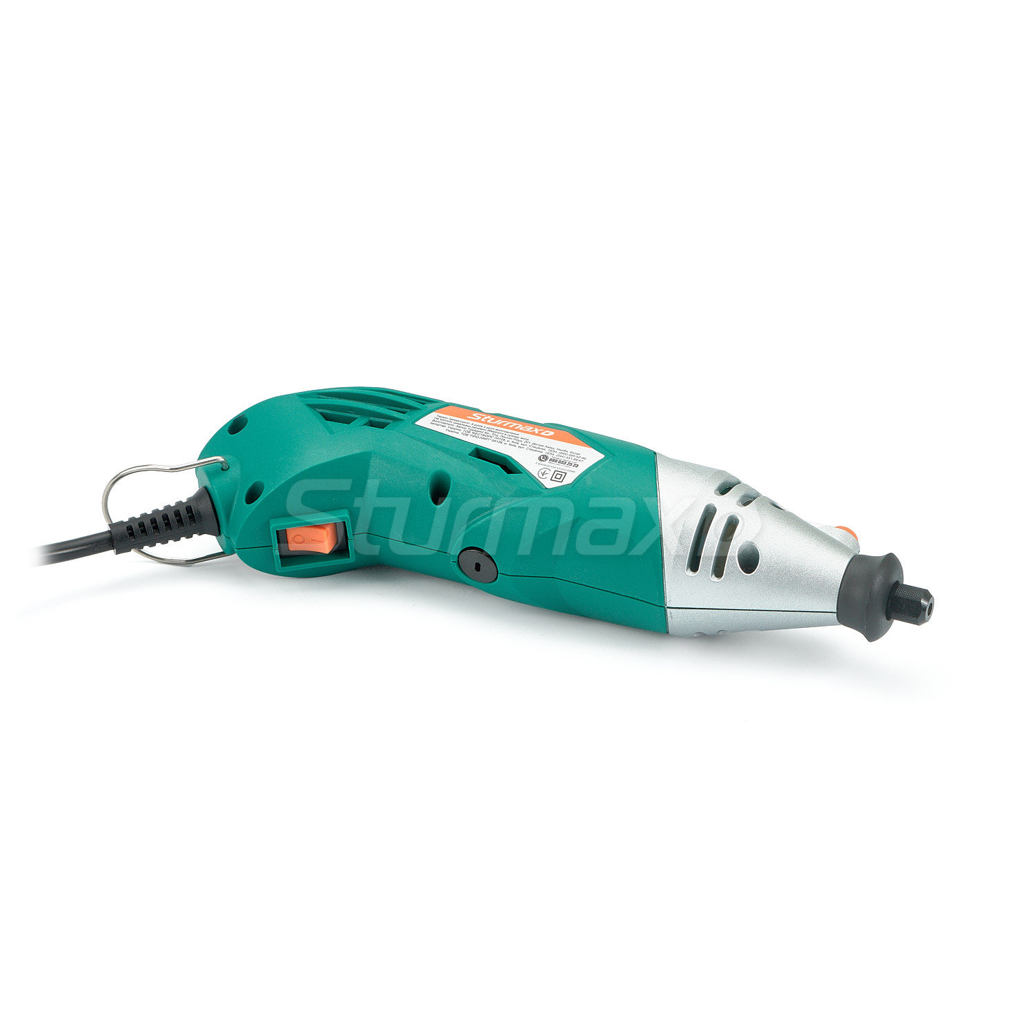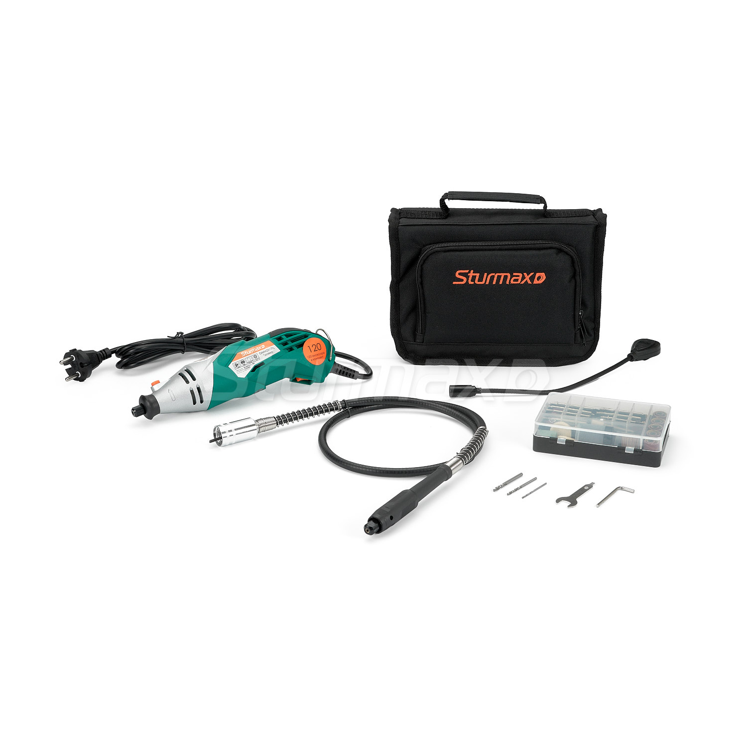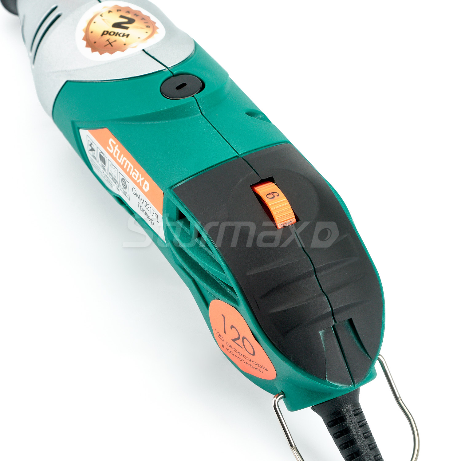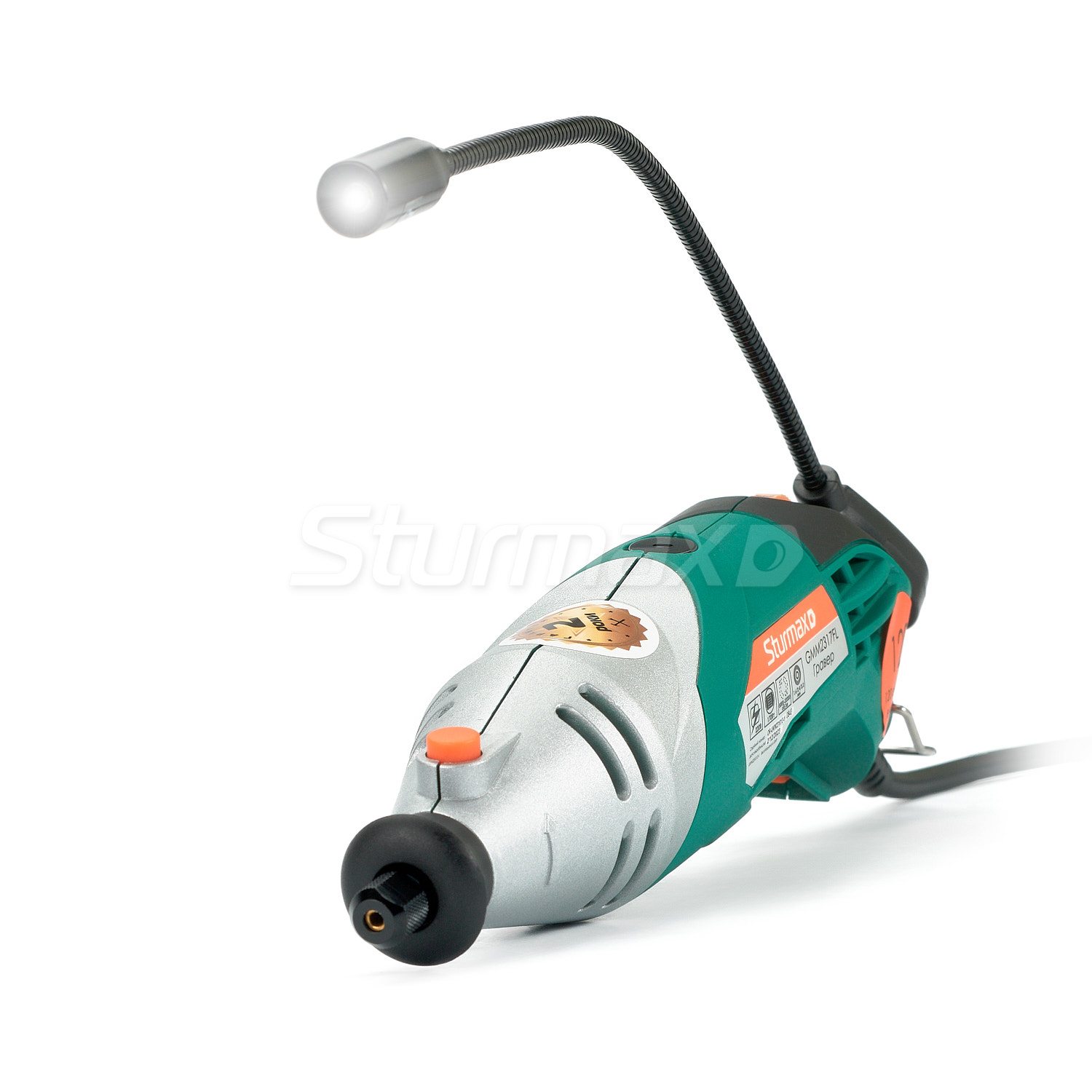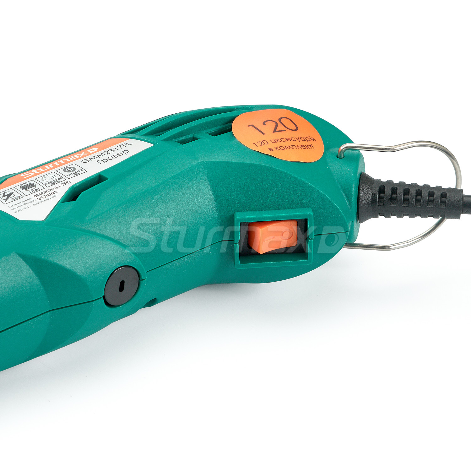 Sturmax GMM2317FL – компактний та ергономічний електричний гравер – призначений для шліфування, свердління, полірування, фрезерування, різання, гравіювання, очищення різних поверхонь. Підходить для роботи з деревом, металом, склом, каменем, керамікою. Модель оснащена функцією електронного регулювання обертів, завдяки якій користувач може налаштувати оптимальну швидкість обертання оснастки у широкому діапазоні від 8000 до 32000 об/хв. Для легкої та зручної заміни оснащення передбачена можливість блокування валу шпинделя. Зручність роботи в умовах недостатнього освітлення забезпечує штатне LED підсвічування, встановлене на гнучкій штанзі. Наявність функції швидкого доступу до щіток дозволяє проводити їх заміну без необхідності розбирання корпусу інструменту. Модель Sturmax GMM2317FL отримала розширену базову комплектацію, куди входять: метровий гнучкий вал, що сприяє ефектному використанню пристрою в місцях із утрудненим доступом, три цанги різних діаметрів (1.6/2.4/3.2 мм), для різних видів робіт, набір аксесуарів зі 120 одиниць, що значно розширює функціональність інструменту, а також міцний чохол, для зручності зберігання та транспортування.