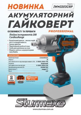 Увага! Комплектація гайковерта Sturmax IWM3203CRP не включає в себе акумулятор, зарядний пристрій, кейс.