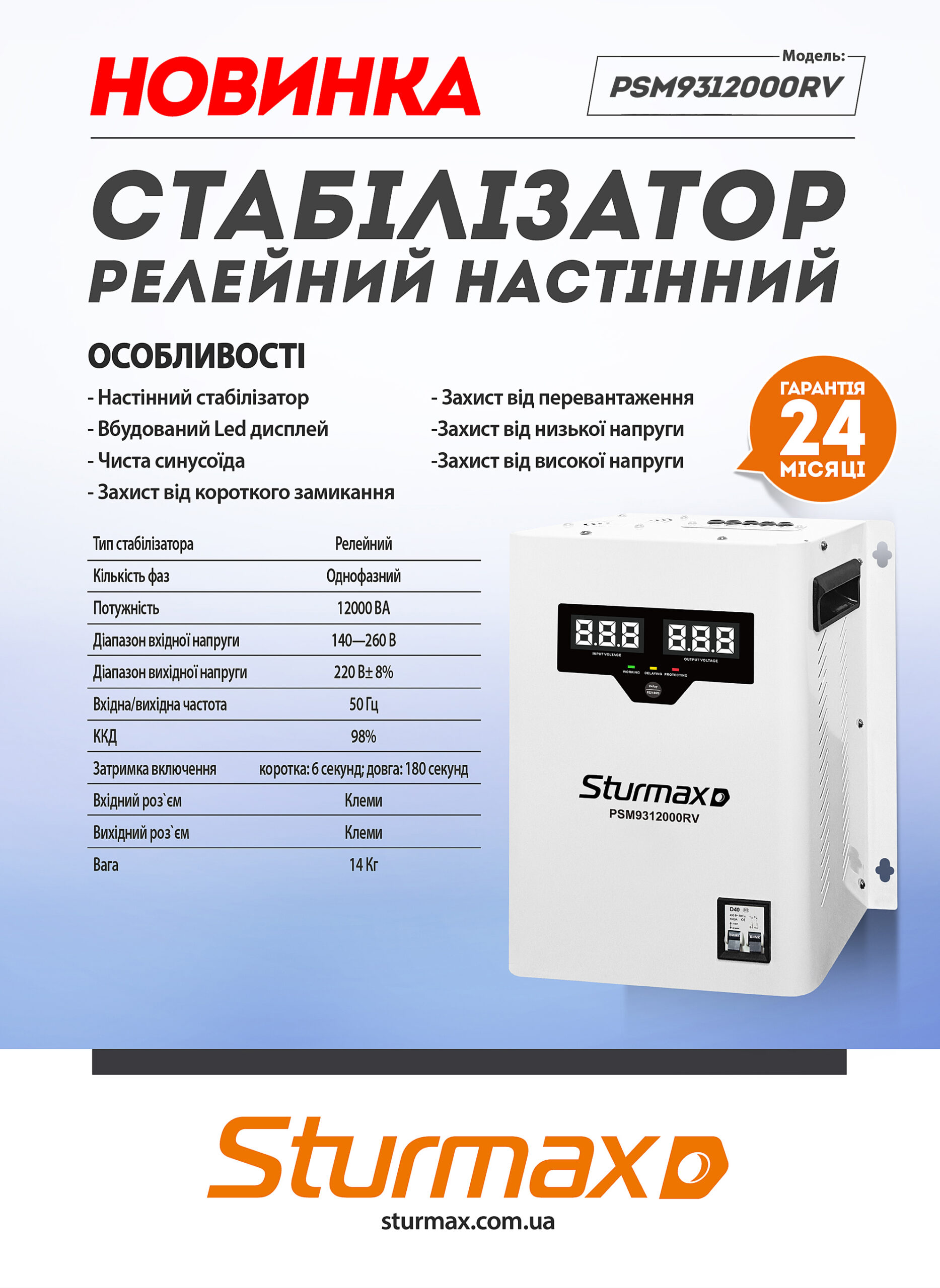 Sturmax PSM9312000RV – настінний, однофазний стабілізатор напруги релейного типу номінальною потужністю 12000ВА. Призначений для підтримки стабільної напруги: захисту різного побутового обладнання від зниженої та підвищеної напруги, а також різких перепадів напруги в мережі. Модель виконана у міцному металевому корпусі, що забезпечує надійний захист внутрішніх елементів від можливих механічних пошкоджень. Поріг стабілізації пристрою становить від 140 до 260В, що гарантує можливість безперервної роботи підключених електроприладів навіть за умови занадто високих або низьких показників напруги в мережі. Точність стабілізації – 220 ± 8%. Передбачена функція затримки увімкнення пристроїв-споживачів – користувач може вибирати між тривалістю затримки 6, або 180 секунд. Для забезпечення безпеки у разі будь-яких позаштатних ситуацій, стабілізатор Sturmax PSM9312000RV має захист від перевантаження та короткого замикання. Візуальний контроль роботи пристрою досягається за допомогою інформативного LED дисплея на передній панелі. Підключення стабілізатора до мережі здійснюється за допомогою клемної колодки.